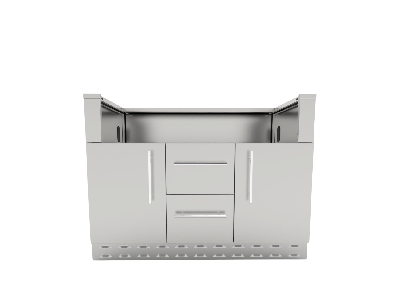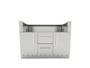 El gabinete base para parrilla a gas Sunstone de 46 pulgadas está diseñado exclusivamente para recibir varios modelos de parrillas a gas de la marca desde el primer momento y es fácil de instalar. El gabinete viene de serie con un cerramiento de puerta en el lado derecho e izquierdo para un tanque de propano o un cubo de basura con dos cajones grandes centrales con amplio espacio de almacenamiento para todos sus utensilios para barbacoa, condimentos y salsas. El gabinete viene completamente ensamblado, solo es necesario fijar las cuatro patas de clavija incluidas, atornillar en su lugar cada manija de varilla de acero inoxidable 304 y montar las placas protectoras delanteras y traseras.